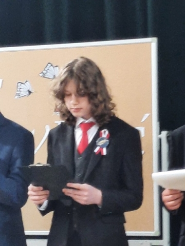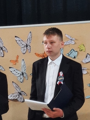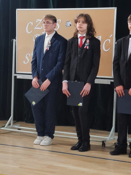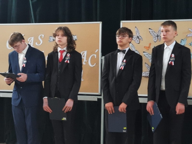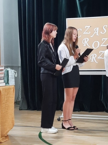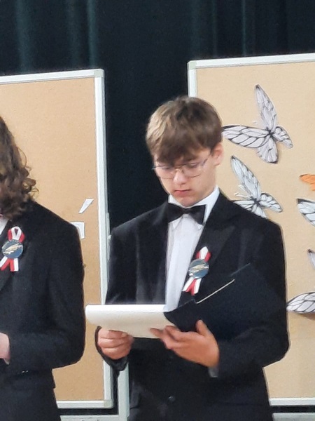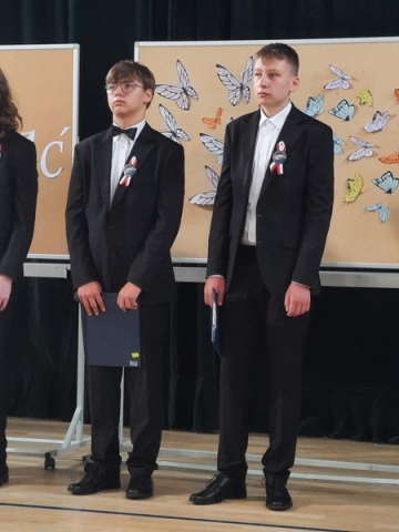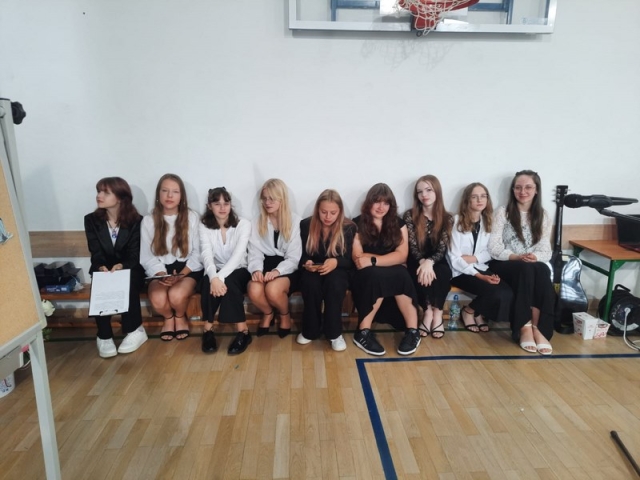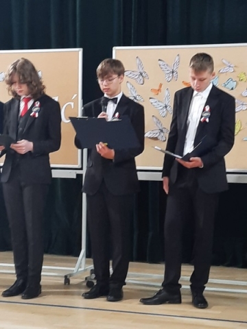 Klasa VII złożyła życzenia odchodzącej klasie i wręczyła upominki. Po części artystycznej