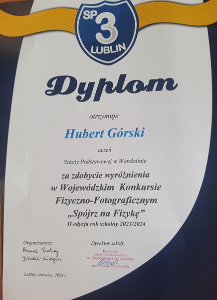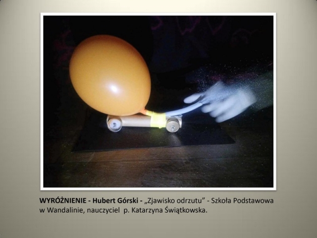 Uczeń klasy VII Hubert Górski uzyskał wyróżnienie w konkursie fizycznym „Spójrz na fizykę”” za przedstawienie i opisanie zjawiska odrzutu.