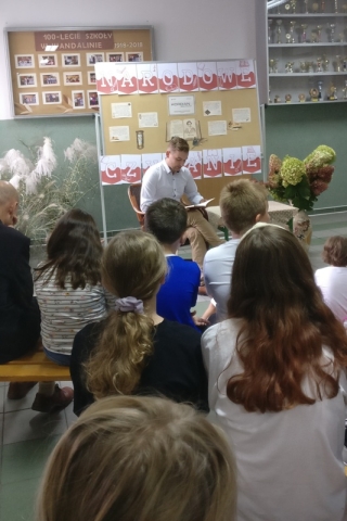 Zgodnie z tradycją, w naszej szkole odbywa się Narodowe Czytanie. W tym roku, lekturą przewidzianą do tego przedsięwzięcia jest „Kordian” Juliusza Słowackiego. Zgromadzeni uczniowie i nauczyciele najpierw wysłuchali kilku informacji przybliżających im realia życia Polaków za czasów zaborów, ich dążenie do wolności i szukanie sposobów walki o nią, ciekawie przedstawionych przez naszego pana od historii, Jarosława Łagunę. Następnie Pan Daniel Pogoda wcielił się w postać głównego bohatera lektury, pięknie czytając fragment jego monologu. Uczniowie, zarówno starsi, jak i młodsi oraz nauczyciele w skupieniu słuchali czytanego tekstu. Na zakończenie była chwila refleksji oraz wypowiedzi dotyczące tekstu przez chętnych uczestników tego wydarzenia.