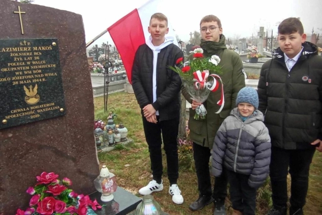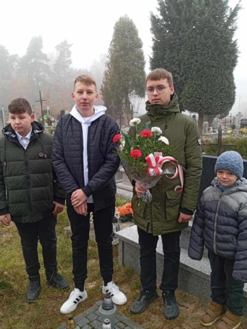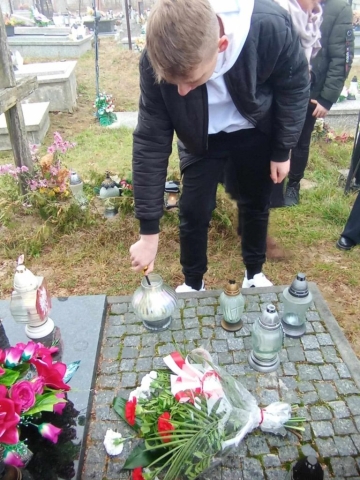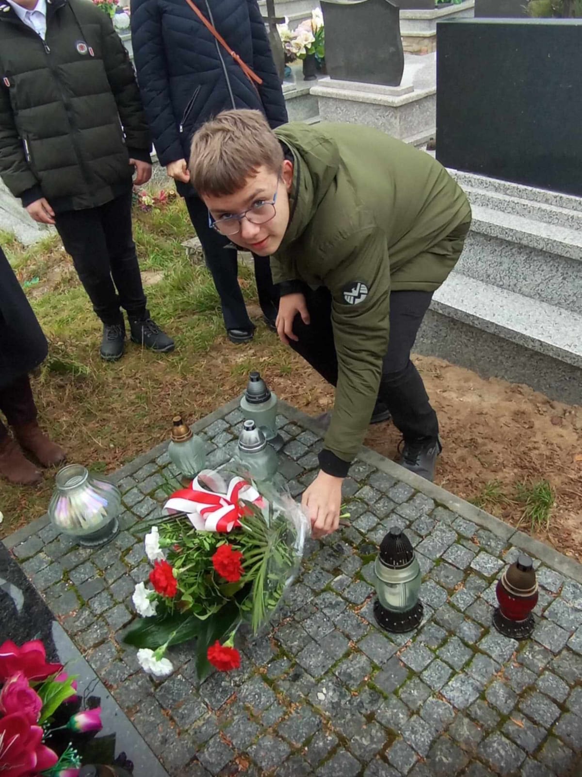 O godz.9.00 delegacja naszych uczniów złożyła kwiaty przy pomniku Dowódcy Batalionów Chłopskich na cmentarzu w Bobach.