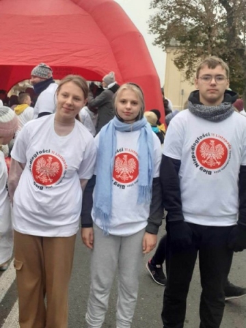 Następnie o godz. 10:00 rozpoczęliśmy manifestację patriotyczną i złożenie kwiatów w miejscach pamięci w Opolu Lubelskim. O 13.40 nasi uczniowie wzięli udział w „Biegu Niepodległości 11 Listopada”, którego celem była promocja aktywności fizycznej i zdrowego stylu życia, a w szczególności popularyzacja idei biegania.