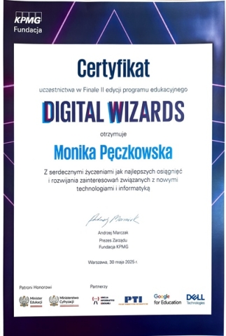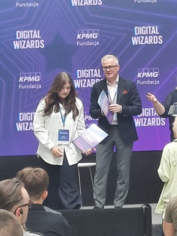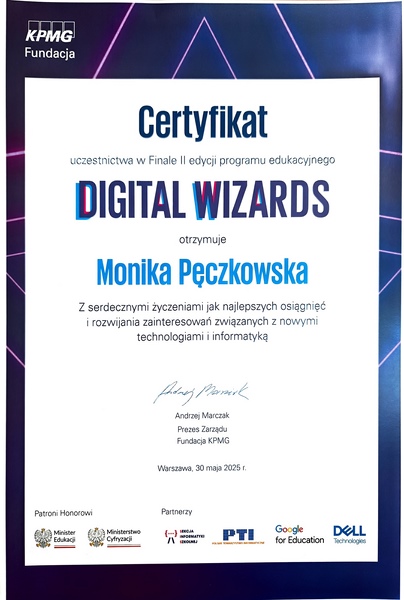 Miło nam poinformować, że uczennica Monika Pęczkowska została finalistką ogólnopolskiego konkursu informatycznego Digital Wizards. Znalazła się wśród 59 uczniów z całej Polski, którzy zostali wyłonieni po dwóch etapach konkursu z ok.16 000 uczestników. W dniu dzisiejszym 30 maja w Warszawie przedstawiła swój projekt dotyczący wykorzystania AI w rolnictwie oraz uczestniczyła w teście nt. sztucznej inteligencji, social mediów, higieny cyfrowej oraz cyberbezpieczeństwa. Organizatorem konkursu jest Fundacja KPMG a partnerami programu Digital Wizards były Sekcja Informatyki Szkolnej Polskiego Towarzystwa Informatycznego, firma Google Polska,firma Dell Technologies Polska. Patronem honorowym konkursu było również Ministerstwo Edukacji Narodowej oraz Ministerstwo Cyfryzacji.