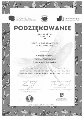 W dniach 24-25 kwietnia 2025 r., w Ośrodku Edukacji Ekologicznej Nadleśnictwa Janów Lubelski, odbył się IV etap XXIV edycji ogólnopolskiego Konkursu Poznajemy Parki Krajobrazowe Polski. Wydarzenie odbywało się pod Patronatem Honorowym: Marszałka Województwa Lubelskiego – Jarosława Stawiarskiego. Patronat medialny nad konkursem objęło TVP 3 Lublin i Radio Lublin. Koordynatorem wojewódzkim była Pani Jolanta Kiszka – Zespół Lubelskich Parków Krajobrazowych Oddział w Janowie Lubelskim.